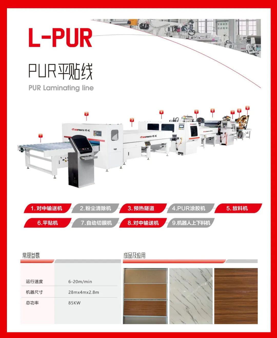 可片材、可卷材混合生產(chǎn)。通用PET、PETG、PP、PVC、CPL、防火板、亞克力、鋁箔、SPC等飾面材,利用PUR膠水均勻平貼或包覆到板材表面。 通用于包覆種類(lèi)的產(chǎn)品,比如:硅酸板、水泥纖維板、門(mén)芯板多層墻板等材料進(jìn)行PUR膠水涂布后包覆各種柔性貼材。