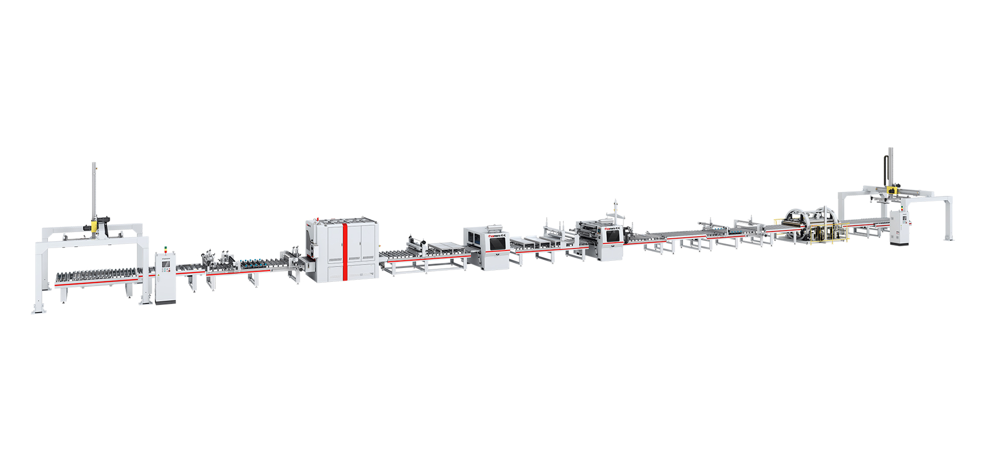 本生產(chǎn)線由:龍門上下料機 — 對中輸送機 — 輸送機 — 倒角機 — 砂光機 — 粉塵清除機 — PUR涂膠機(含溶膠系統(tǒng)) — 恒溫隧道 — 平貼機 — 斜切機 — 輸送機 — 精密修邊機 — 輸送機 — 圓筒式翻板機 — 輸送機 — 對中輸送機 — 龍門上下料機等部分組成。