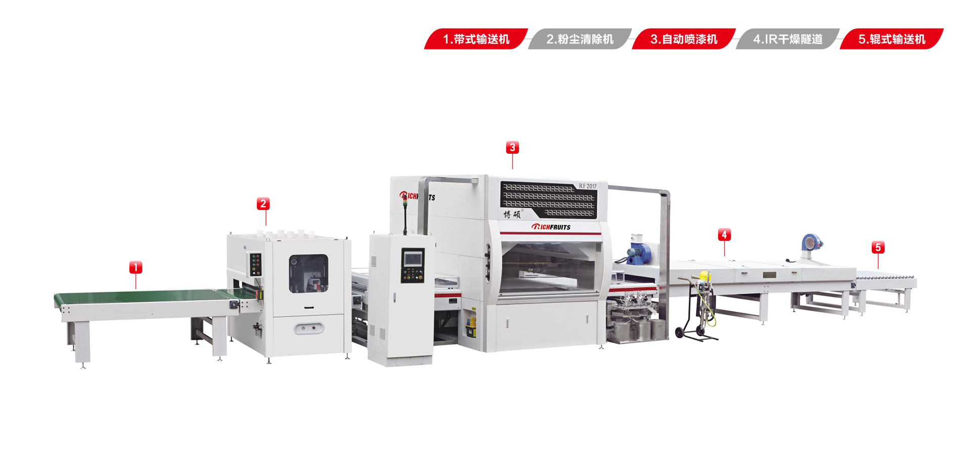 適用于板式家具、實(shí)木門、櫥柜門、工藝品、裝飾板、硅酸鈣板、玻鎂板、水泥纖維板的板式加工件的平面和四個(gè)側(cè)邊進(jìn)行高質(zhì)量、大批量連續(xù)噴漆。