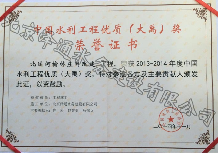 2013-2014年度中國(guó)水利工程優(yōu)質(zhì)(大禹)獎(jiǎng)榮譽(yù)證書(shū)