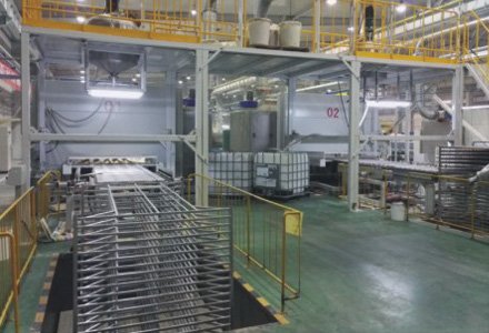 產(chǎn)品種類 外墻保溫裝飾一體板(水包水多彩漆、真石漆、水包砂) 產(chǎn)線數(shù)量 基板處理生產(chǎn)線1條、自動(dòng)噴涂線1條 設(shè)備特色 整線自動(dòng)化,從進(jìn)板到出板一次性完成。 生產(chǎn)產(chǎn)能 水包水多彩漆、真石漆、水包砂65萬平方米 油漆干燥方式 連線豎式折葉干燥隧道 生產(chǎn)人員數(shù)量 18人 廢氣廢水處理 光氧處理、水過濾循環(huán)處理 -