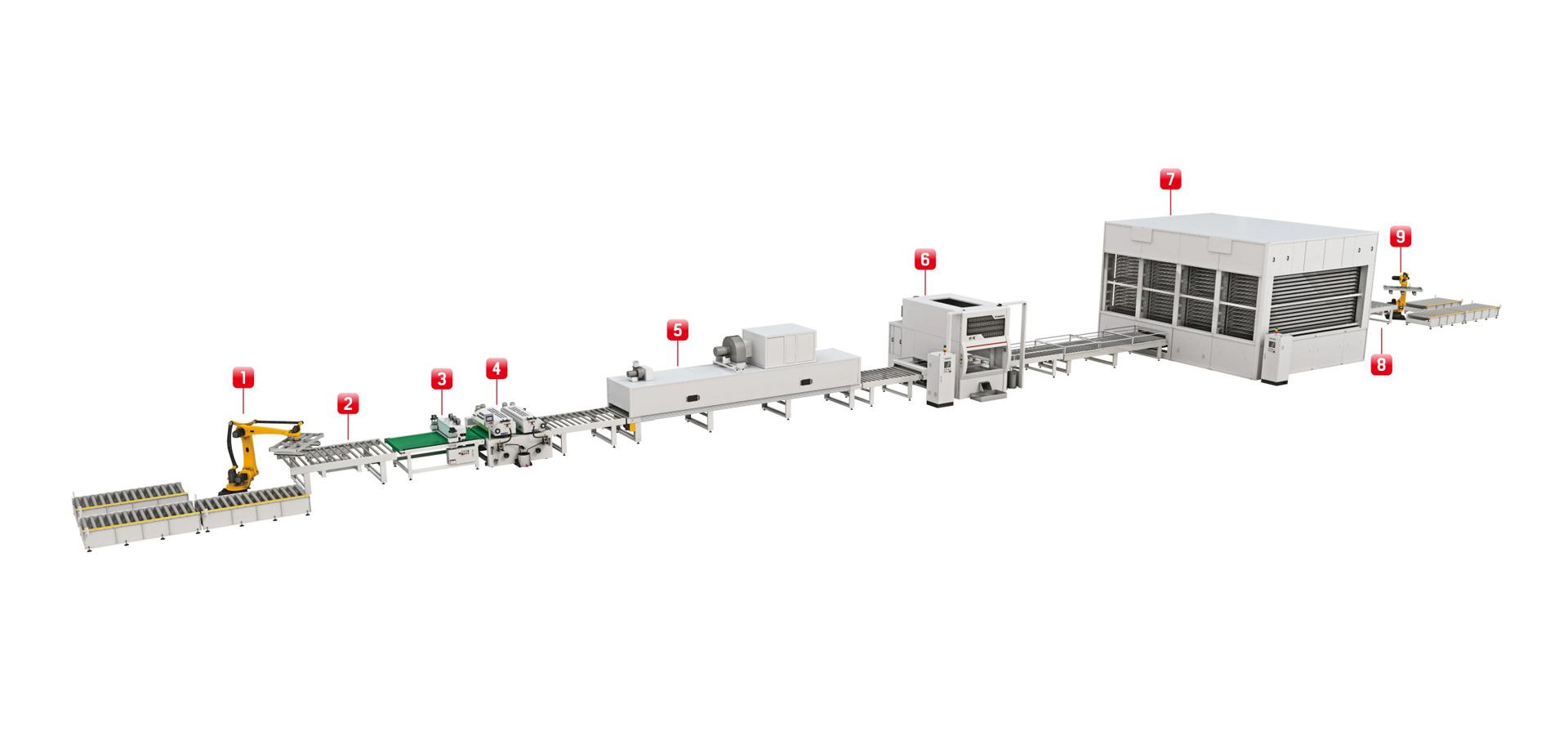 預輥實色乳膠中涂,再噴涂真石漆沙粒效果,避免了透底的現(xiàn)象。后段配平鋪式立體干燥房,避免了厚噴漆膜流掛的現(xiàn)象,同時實現(xiàn)油漆快速干燥,將能耗降至最優(yōu)。